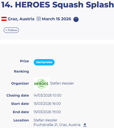 Anmeldung unter: https://www.rankedin.com/en/tournament/64801/14-heroes-squash-splash